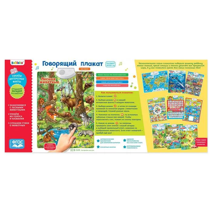 Говорящий электронный плакат «Лесные животные», работает от батареек — Характеристики
