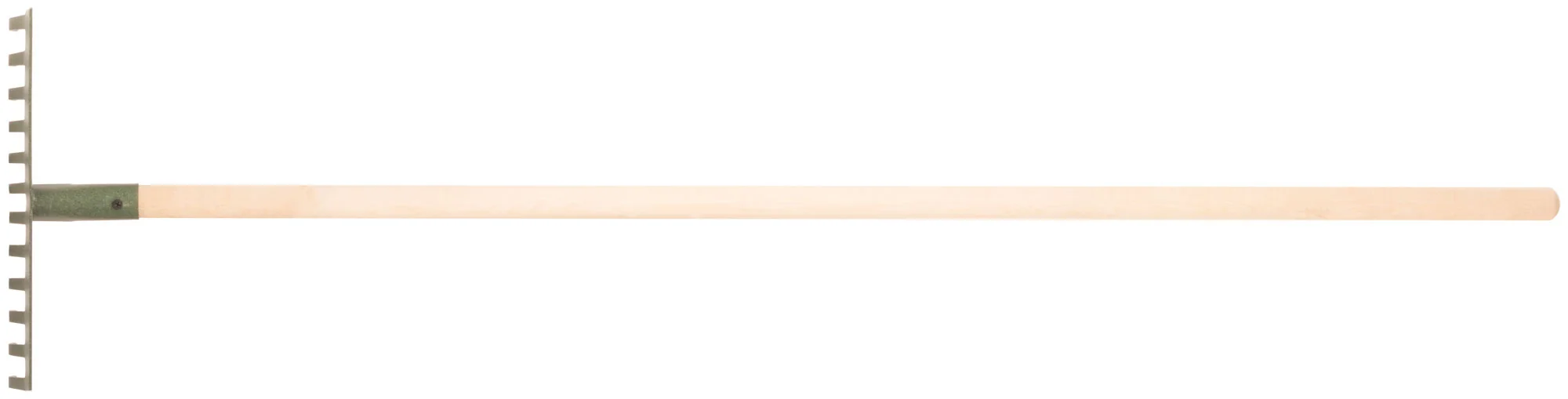 Грабли оснащены деревянным черенком, который обеспечивает надежный хват и комфортное использование. Зубья из инструментальной стали гарантируют долговечность и устойчивость к износу.