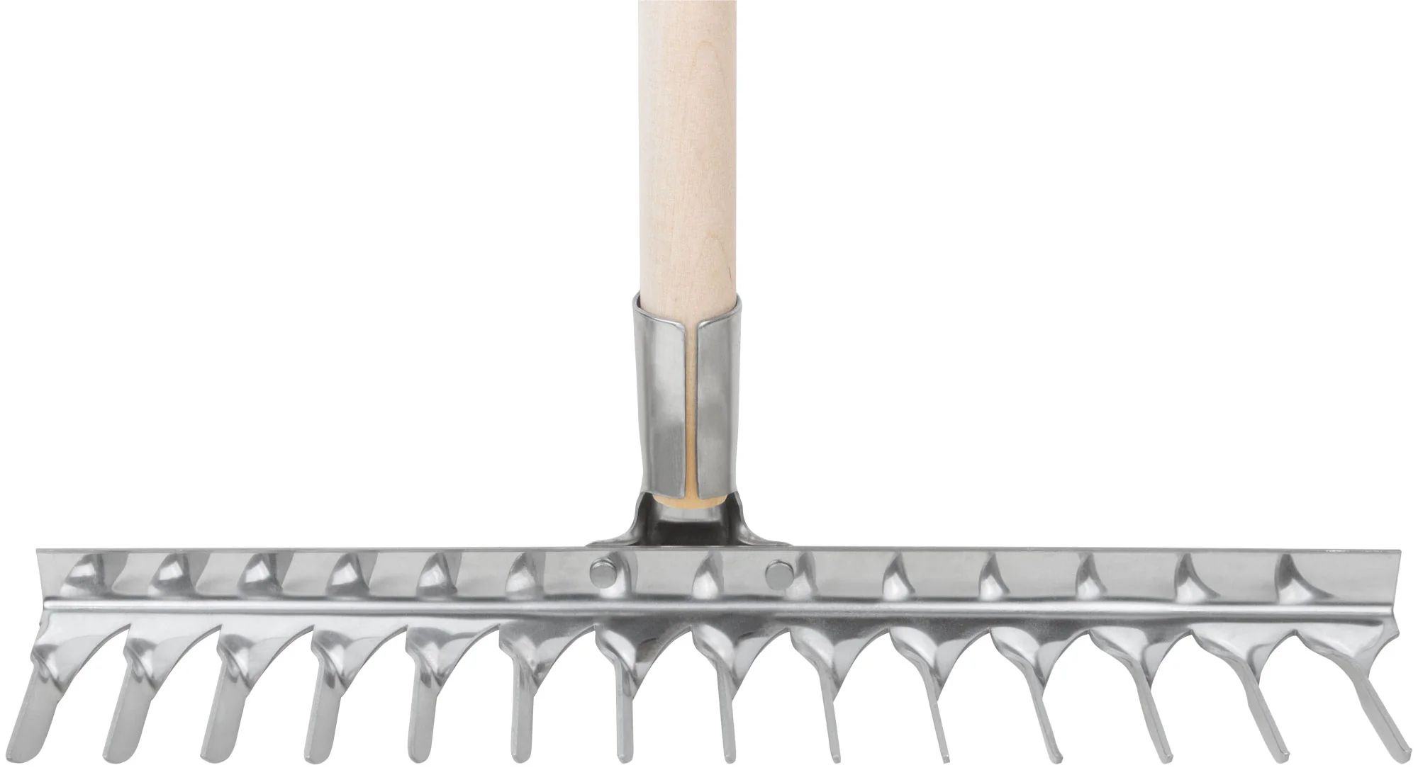 Конструкция граблей включает витые зубья, что способствует улучшенному захвату и сбору материалов. Использование нержавеющей стали предотвращает коррозию, увеличивая срок службы инструмента. Деревянный черенок обеспечивает удобный захват и снижает усталость при длительном использовании.