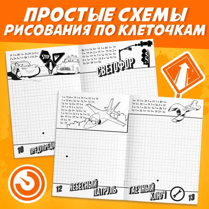 Графические диктанты в формате книжки — увлекательное и полезное занятие для детей 5–7 лет. Простые схемы рисования по клеточкам помогут ребёнку развивать усидчивость, внимательность и аккуратность, а также подготовят руку к письму. Тематика рисунков вдохновлена миром мультфильма Тачки, что делает процесс ещё более интересным для юных любителей автомобилей.