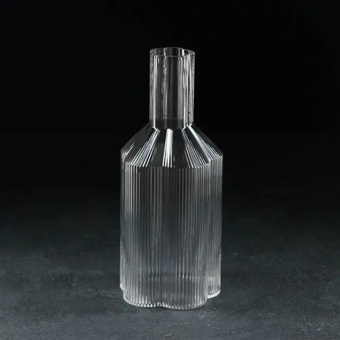 - Рельеф: никаких принтов — только фактура стекла. Узор создаёт тактильную и визуальную глубину, не отвлекая от содержимого. Такой графин не затеряется среди гладкой посуды.