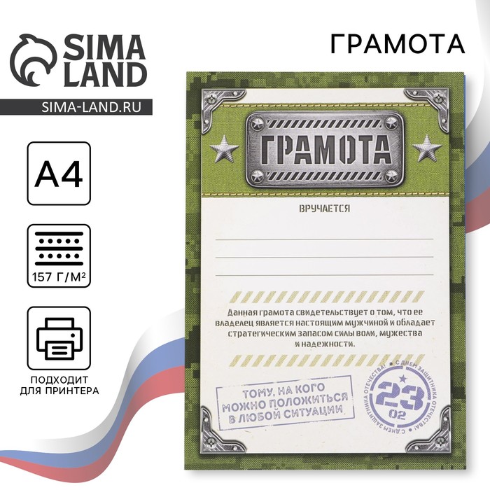 Грамота изготовлена из мелованной бумаги плотностью 157 г/кв.м.