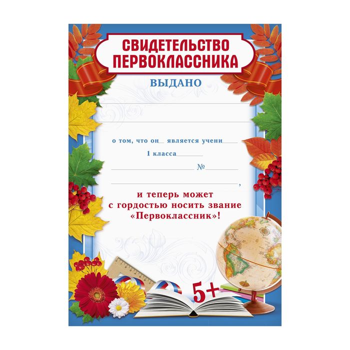 Грамота школьная на 1 сентября «Свидетельство первоклассника», А5, 157 г/м². — Характеристики