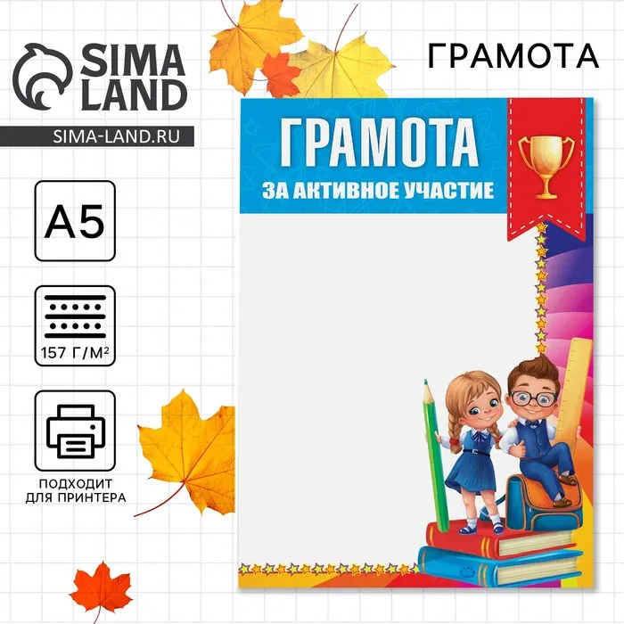 Грамота школьная «За активное участие», А5, 157 гр/кв.м — Характеристики