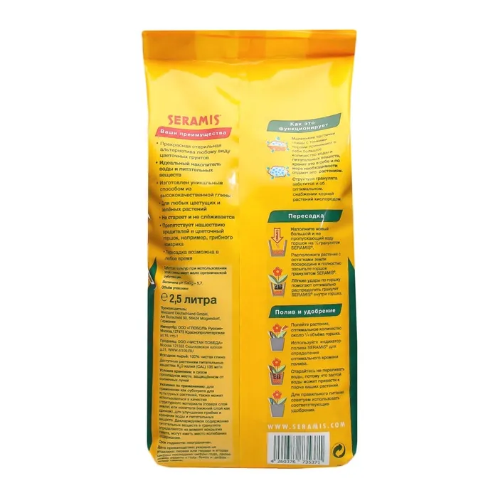 Особенности: растения роскошно развиваются и выглядят здоровыми. Seramis - гранулят предлагает ещё больше преимуществ: он лёгкий, не стареет и не слёживается, предотвращает грибного комарика. Пересадка растений досрочно простая и всегда возможна, независимо от возраста и роста растения.