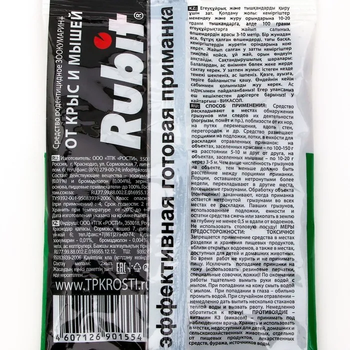 Область применения: для истребления мышей и крыс в личных подсобных хозяйствах. Изготовлены из комплекса злаков. Обладают наибольшей эффективностью в борьбе с вредоносными грызунами.