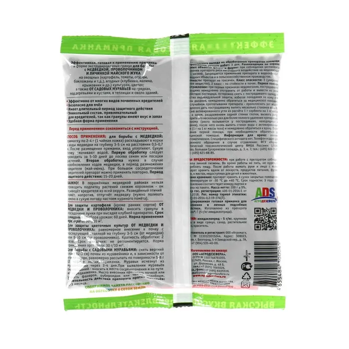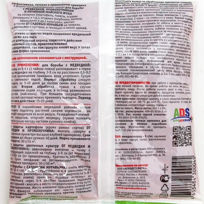 Эффективная, готовая к применению приманка в форме экструдированных гранул для борьбы с медведкой, проволочником и личинкой майского жука:на овощных (картофель, томаты, огурцы, баклажаны и т.д.) ягодных (клубника, малина, крыжовник и др.) культурах, цветахА также от садовых муравьёв: на грядкахпод деревьями и кустамив теплицах и около зданийСпособ применения:Для борьбы с медведкой: приманку по 2-4 г (1 чайная ложка) раскладывают в норки и ходы медведки на глубину 3-5 см на расстоянии 0,5-0,7 м. После размещения приманки, вход уплотняют. Сухую почву смачивают водой. Первую обработку следует проводить за 5-10 дней до посева семян или посадки растений. Вторая обработка нужна в случае возобновления ходов медведки, в период размножения вредителя (май-июнь). При большом сосредоточении вредителей препарат можно применять повторно.Период защитного действия: 15-20 дней. В поражённых медведкой районах нельзя проводить подпитку растений свежим коровяком-он приведёт вредителя из всей округи. Разведённый птичий помёт, (нужно поливать землю в сухую погоду настоем куриного помёта). СОСТАВ: имидаклоприд - 5г/кг, крупяная смесь в виде гранул, сахар, растительное масло, краситель. Подробнее: https://xn--80ado1abokv5d.xn--90ais/p179535203-napoval-200gr-medvedki.html