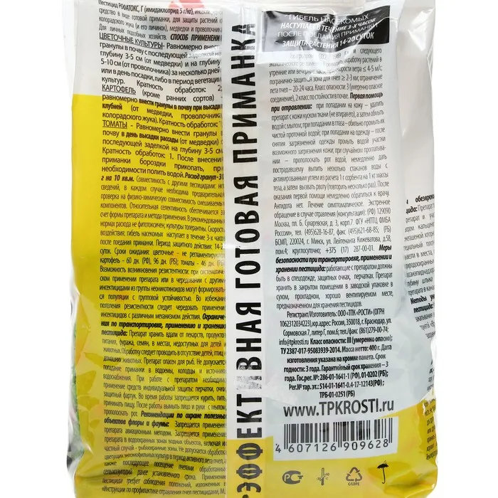 Гранулы от медведки и проволочника Rubit Рофатокс 400 г профи 59023 - готовая приманка для уничтожения садовых вредителей.Способ применения: гранулы необходимо равномерно распределить по почве, после чего их следует заделать на глубину 3-5 см (от медведки) и на глубину 5-10 см (от проволочника). Также необходимо вносить гранулы в почву на глубину 5-10 см до посадки клубней (луковиц) растений или в период вегетации (от проволочника). Норма расхода: 30 г на 10 м². Смешивать с другими препаратами и удобрениями запрещается. Гибель насекомых наступает в течение трех часов после поедания приманки. Состав:имидаклоприд