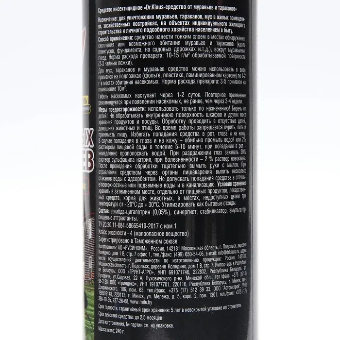 Гранулы Dr.Klaus подходят и против летающих насекомых - благодаря входящему в состав аттрактанту в качестве приманки. Просто разместите гранулы на небольших подложках по 1-2 грамма в помещении. При контакте с гранулами гибель насекомых наступает в течение 48 часов.Удобно в применении - гранулы можно рассыпать в самых труднодоступных местах, трещинах и щелях.СПОСОБ ПРИМЕНЕИЯ:Обязательно используйте средства защиты: наденьте перчатки.Определите возможные места передвижения насекомых: вдоль плинтусов, садовых дорожек.Рассыпьте гранулы в этих местах тонким слоем примерно 10-15 грамм на 1 м².Обязательно используйте средства защиты: наденьте перчатки. Состав:Лямбда-цигалотрин – 0.05%, Синергист – 0.15%, стабилизатор – 0.8%, эмульгатор, пищевые аттрактанты.