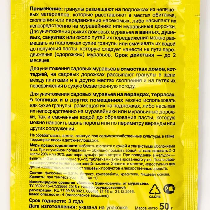 Гранулы от муравьев Великий Воин, цв. пакет, 50 г — Характеристики