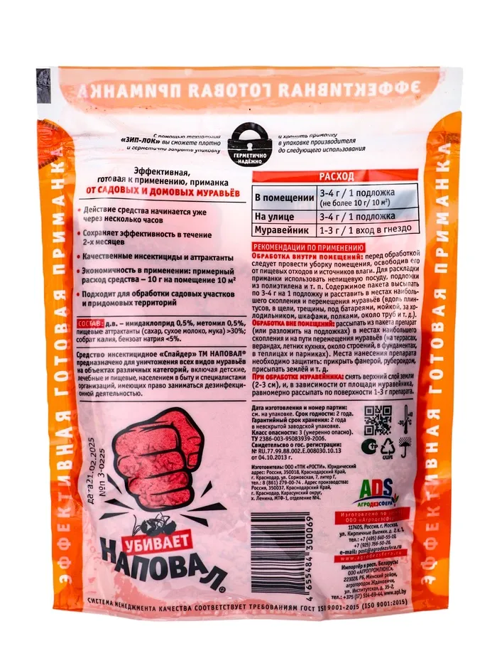 Средство инсектицидное "Наповал" предназначено для уничтожения муравьев на объектах различных категорий, включая детские, лечебные и пищевые, специалистами организаций, имеющих право заниматься дезинфекционной деятельностью и населением в быту.Рекомендации по применению:- Обработка внутри помещений: перед обработкой следует провести уборку помещения, освободив его от пищевых отходов и источников влаги. Для раскладки приманки использовать непищевую посуду, подложки из полиэтилена и т.п. Содержимое пакета высыпать по 3-4 г на одну подложку. Расставить в местах наибольшего скопления муравьев (вдоль плинтусов, в щели, трещины, под батареями, мойкой, за холодильником, шкафами, полками, около труб, горячего водоснабжения, вдоль дорожек и т.д.).- Обработка вне помещений: рассыпать препарат (или разложить на подложках) в местах скопления и на пути передвижения муравьев (на террасах, верандах, в летних кухнях, около строений, в фундаментах, в теплицах, в парниках). Места нанесения препарата необходимо защитить: укрыть фанерой, рубероидом, присыпать землей и т.п. При обработке муравейника - снять верхний слой земли (2-3 см) и, в зависимости от его площади, равномерно рассыпать по поверхности 1-3 г препарата. Действие средства начинается через несколько часов. Сохраняет эффективность в течение 2-х месяцев. Примерный расход средства: 10 г на 10 кв.м.Состав: пищевые аттрактанты (сахар, сухое молоко, мука) >30%; сорбат калия, бензонат натрия <5%; метомил 0,5%, имидаклоприд 0,5%.