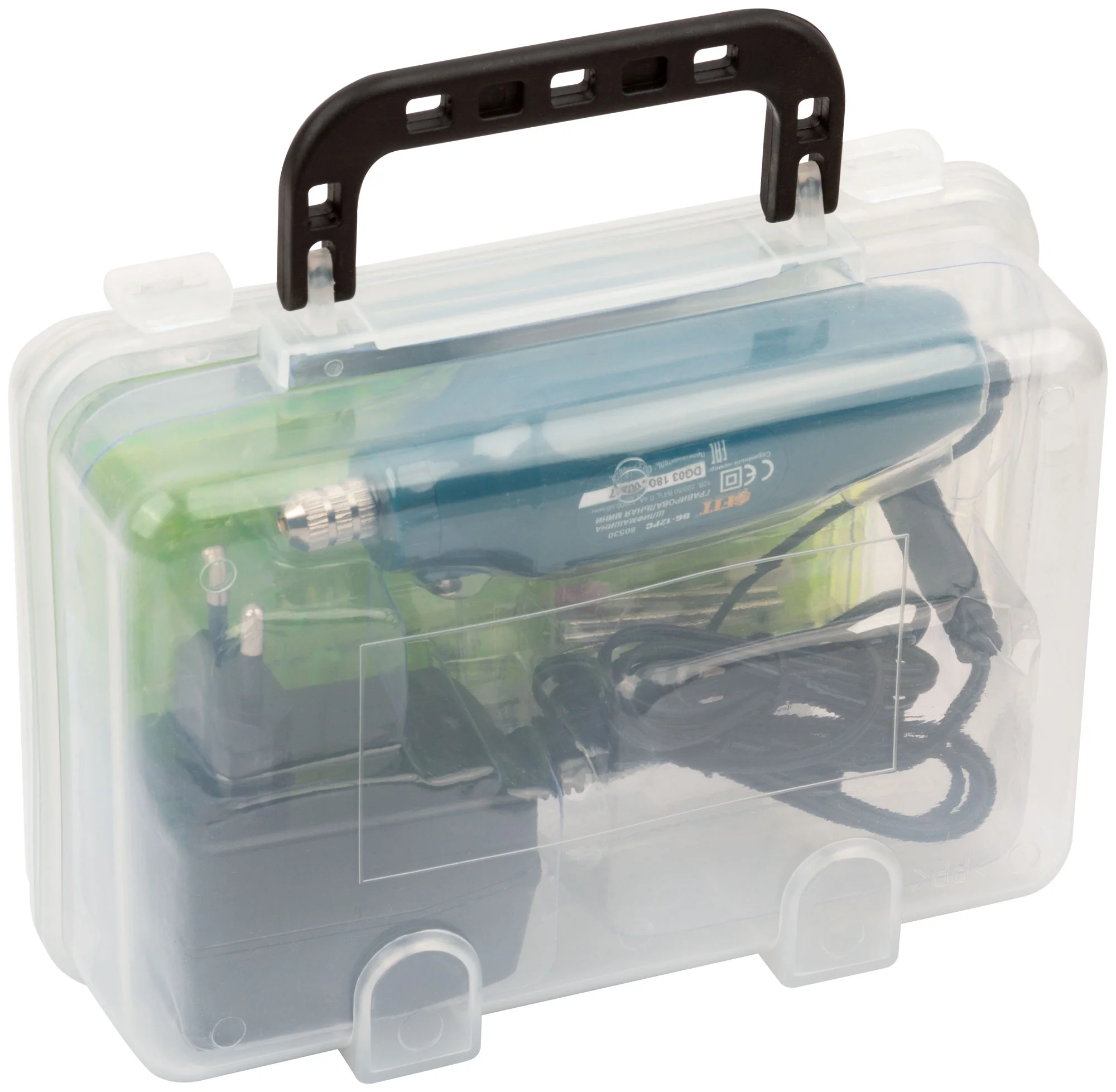 Машина оснащена цанговым патроном для надежной фиксации насадок диаметром 3,2 мм. В комплект входит адаптер на 12 В, что позволяет использовать инструмент даже в условиях отсутствия сети 220 В. Все элементы удобно упакованы в прозрачный пластиковый кейс, который облегчает хранение и транспортировку.
