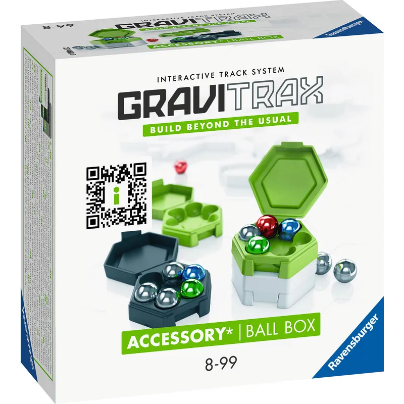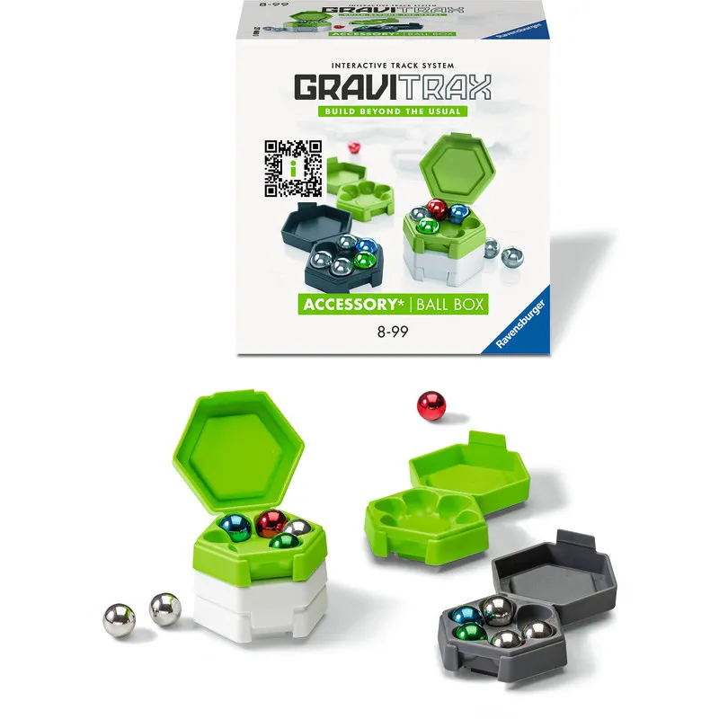 Набор аксессуаров Ravensburger GraviTrax Ball Box включает дополнительные шары для ещё более увлекательного строительства трасс. В комплекте также четыре разноцветные коробки для хранения существующих GraviTrax-шаров. Две из коробок уже заполнены двенадцатью серебряными и разноцветными шарами, которые помогут вам сразу начать игру.