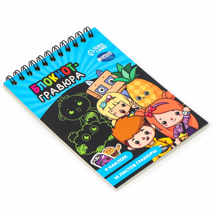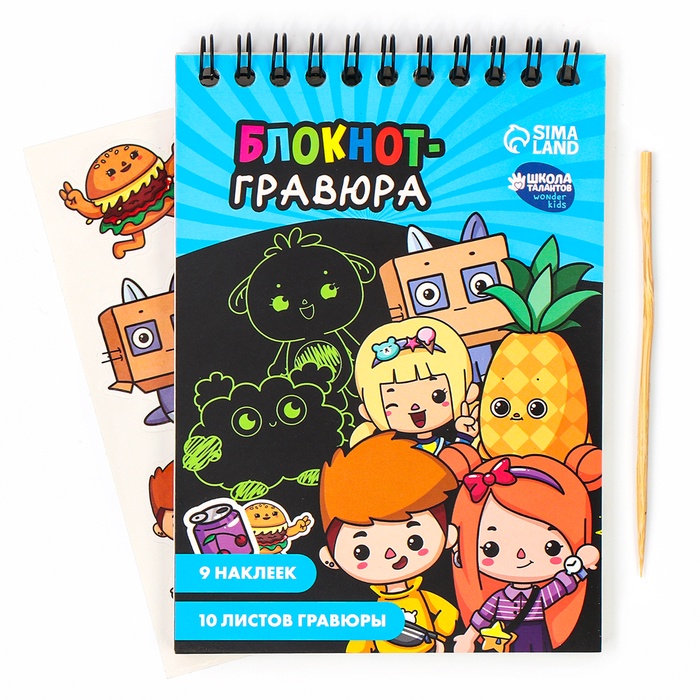 размер блокнота 10,5 х 14,8 см (А6)цветное основание10 листовнаклейки в наборе!Блокнот-гравюра - это безграничное поле для фантазии! Создавайте узоры, рисунки, надписи и делитесь своими шедеврами с друзьями и близкими.