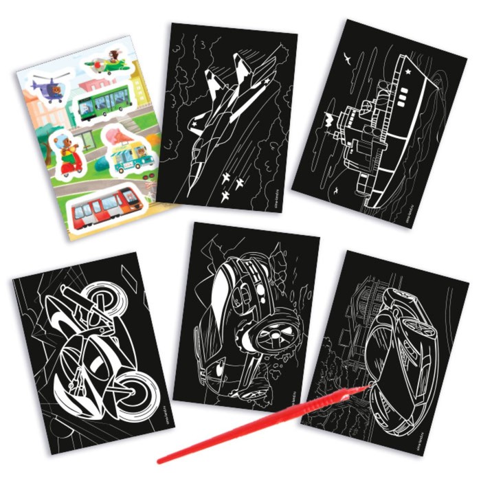 С помощью штихеля нарисуйте что-нибудь на листе: инструмент будет соскребать верхний тёмный слой. Под чёрным фоном скрывается сияющее покрытие, которое сделает ваши рисунки сказочными.