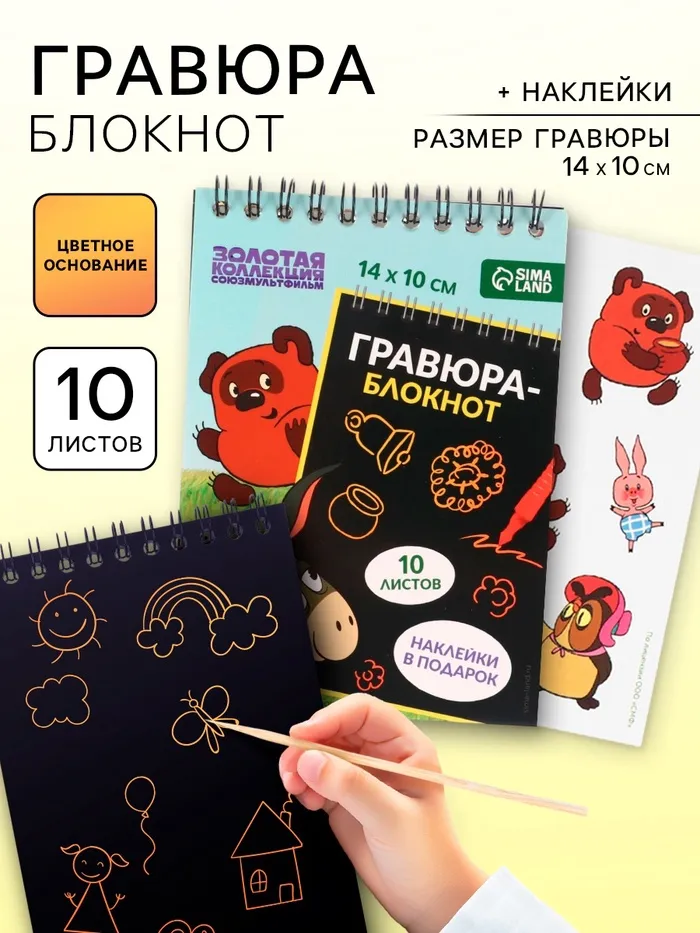 размер блокнота 10,5 х 14,8 см (А6)цветное основание10 листовнаклейки в наборе!Блокнот-гравюра - это безграничное поле для фантазии! Создавайте узоры, рисунки, надписи и делитесь своими шедеврами с друзьями и близкими.