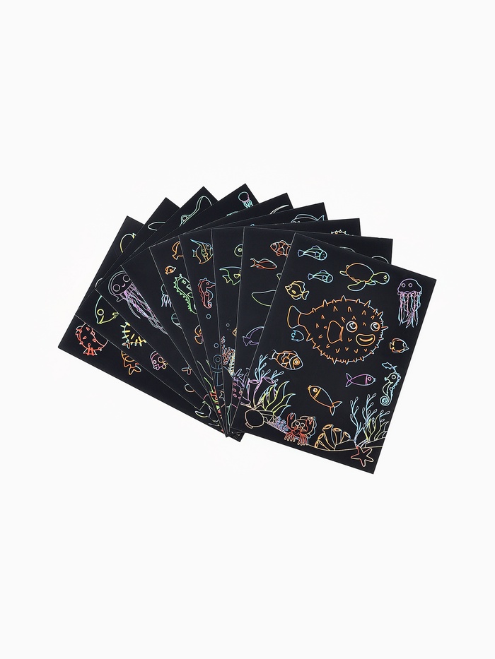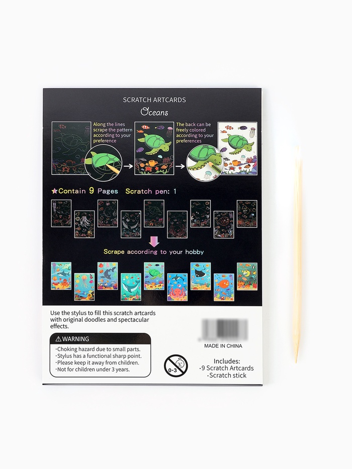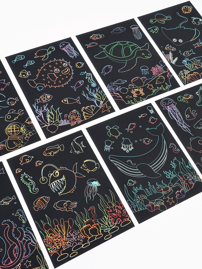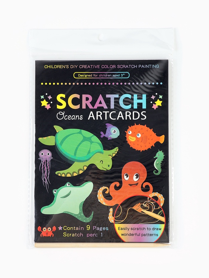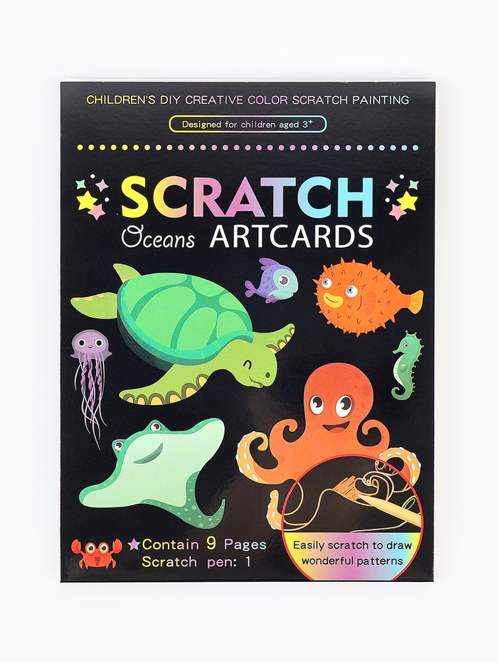 На чёрную основу уже нанесён контур рисунка. Задача ребёнка аккуратно процарапать штихелем белые контуры, чтобы получить яркую картинку!