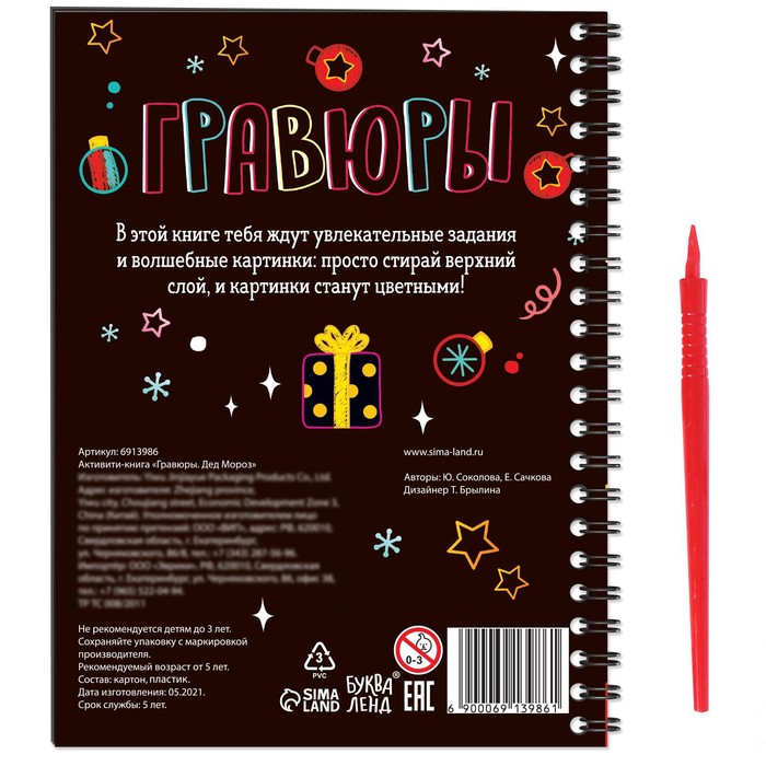 Книга «Гравюры» — это не только интересное занятие для детей, но и отличное средство для обучения и развития. Она развивает фантазию, учит концентрации и аккуратности, это особенно важно на раннем этапе развития. Книга станет отличным подарком к праздникам и займет кроху на долгое время.