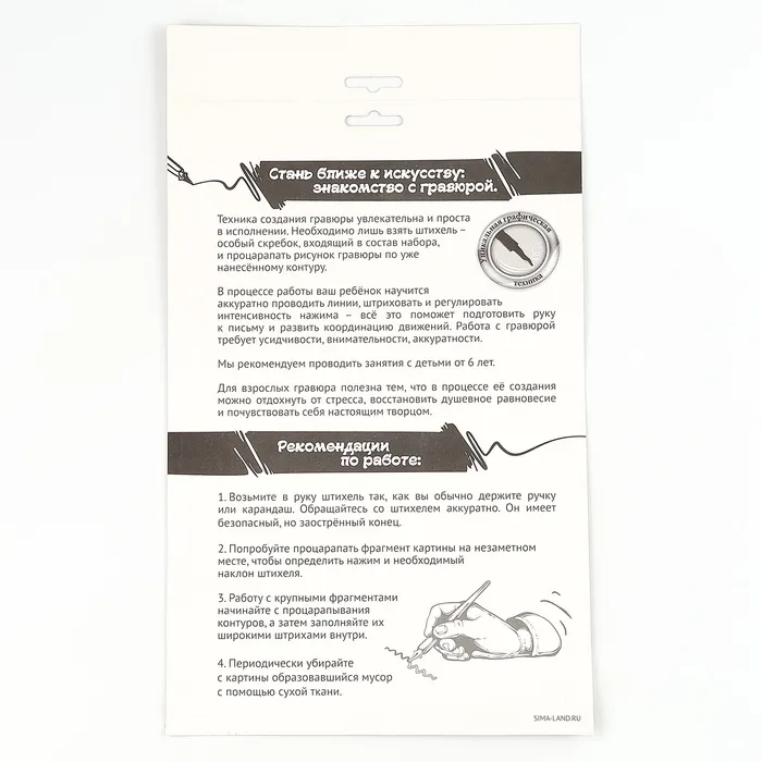 • На чёрную основу уже нанесён белый контур рисунка. Задача ребёнка аккуратно процарапать штихелем белые контуры, чтобы получить яркую картинку!