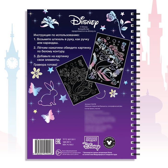 Гравюра для девочек «Принцессы», набор для творчества, голографический фон, 8 гравюр, Дисней — Характеристики