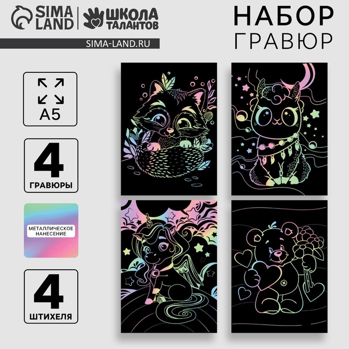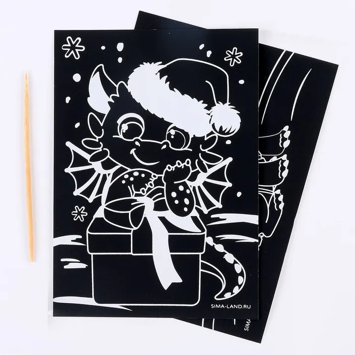 • На чёрную основу уже нанесён белый контур рисунка. Задача ребёнка аккуратно процарапать штихелем белые контуры, чтобы получить яркую картинку!