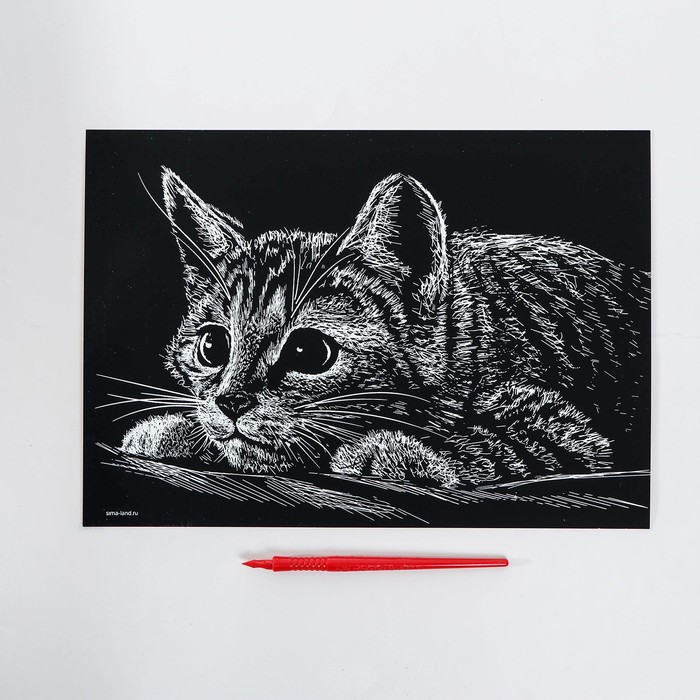 Гравюра представляет собой многослойное панно, покрытое чёрной краской, на которое нанесён контур рисунка. С помощью особого скребка (штихеля), который входит в набор, путём процарапывания и создается гравюра. Новая серия с уникальным дизайном порадует вас разнообразием рисунков.