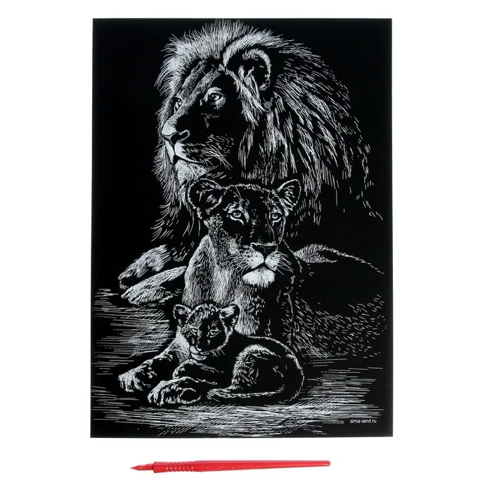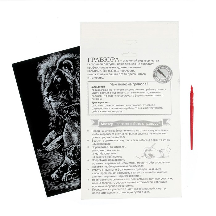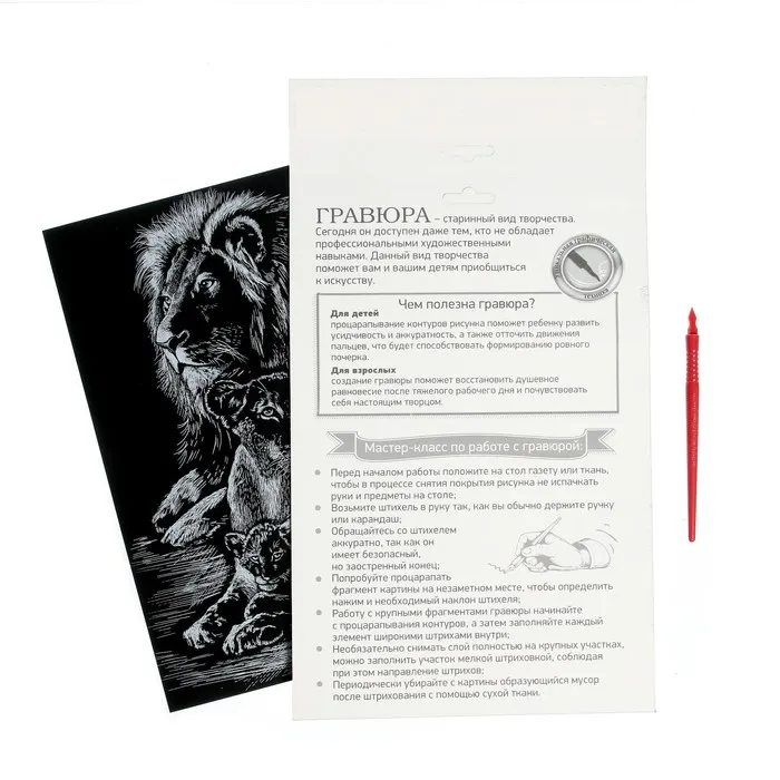 Гравюра представляет собой многослойное панно, покрытое чёрной краской, на которое нанесён контур рисунка. С помощью особого скребка (штихеля), который входит в набор, путём процарапывания и создается гравюра. Новая серия с уникальным дизайном порадует вас разнообразием рисунков.