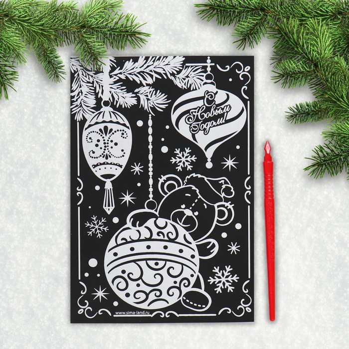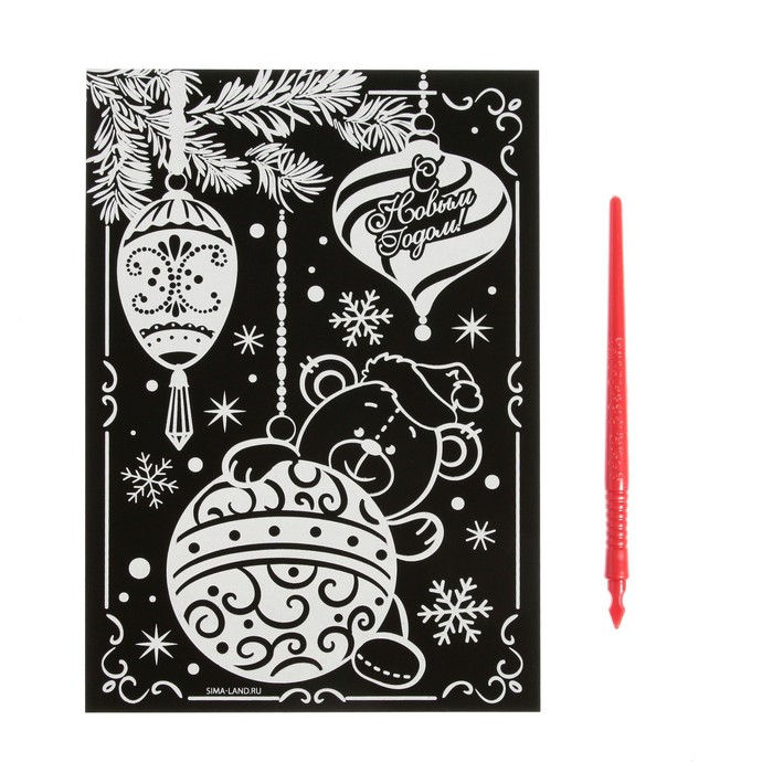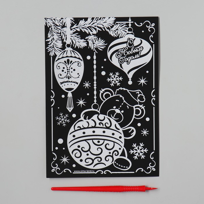 Чтобы создать новогоднюю картинку, достаточно процарапать намеченные контуры рисунка специальным инструментом — штихелем. Малыш с удовольствием будет счищать верхний слой гравюры, под которым находится цветная основа, ведь это так увлекательно!