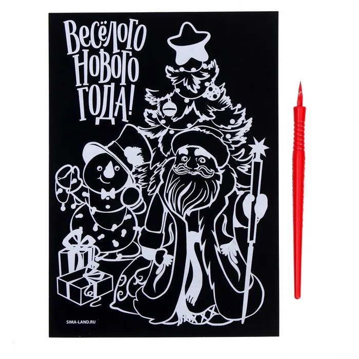 Чтобы создать новогоднюю картинку, достаточно процарапать намеченные контуры рисунка специальным инструментом — штихелем. Малыш с удовольствием будет счищать верхний слой гравюры, под которым находится цветная основа, ведь это так увлекательно!