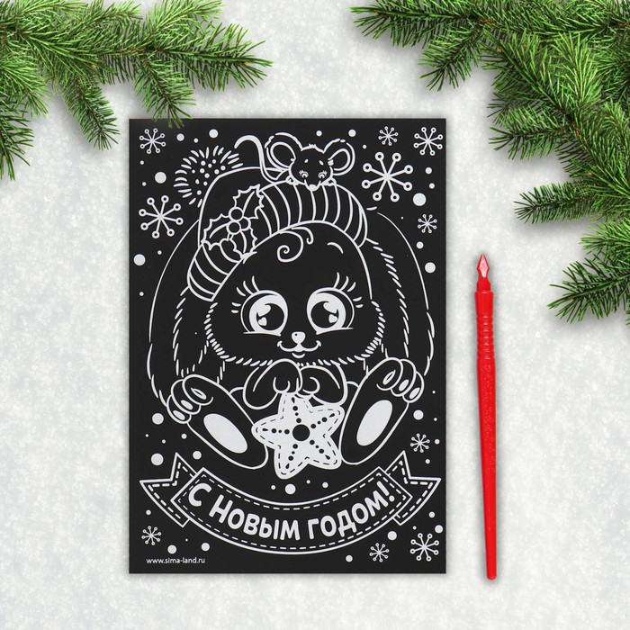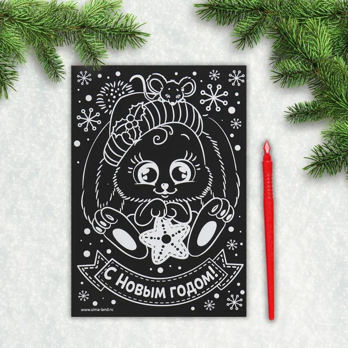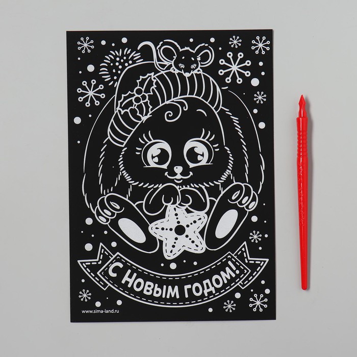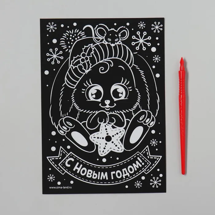 Чтобы создать новогоднюю картинку, достаточно процарапать намеченные контуры рисунка специальным инструментом — штихелем. Малыш с удовольствием будет счищать верхний слой гравюры, под которым находится цветная основа, ведь это так увлекательно!