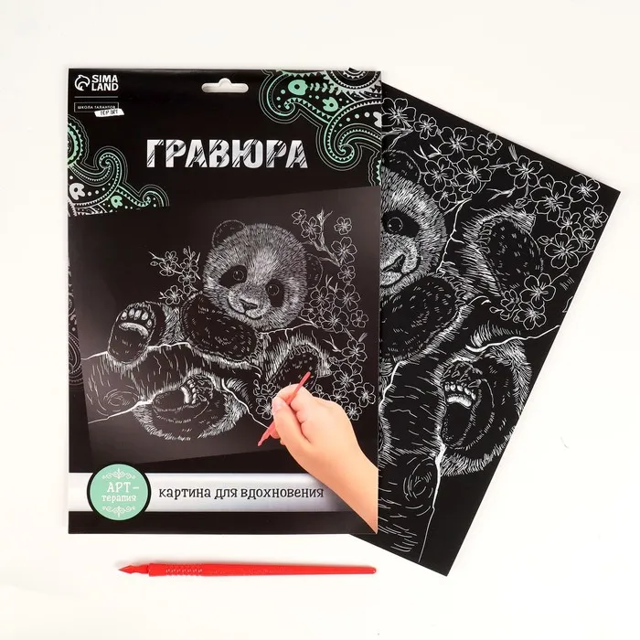 Гравюра представляет собой многослойное панно, покрытое чёрной краской, на которое нанесён контур рисунка. С помощью особого скребка (штихеля), который входит в набор, путём процарапывания и создается гравюра. Новая серия с уникальным дизайном порадует вас разнообразием рисунков.
