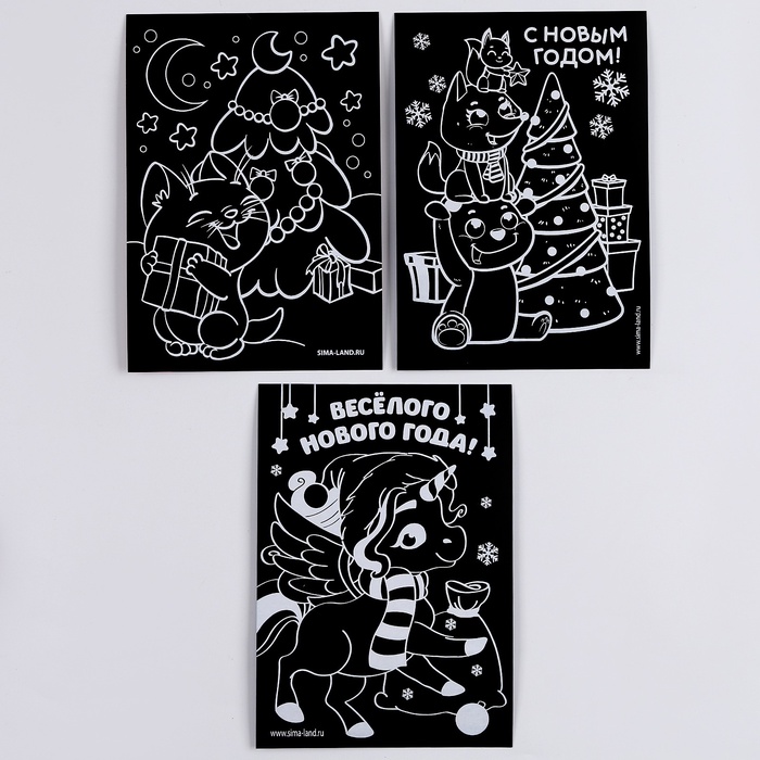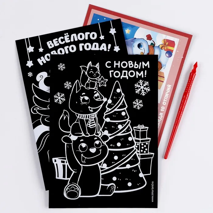 Чтобы создать новогоднюю картинку, достаточно процарапать намеченные контуры рисунка специальным инструментом — штихелем. Малыш с удовольствием будет счищать верхний слой гравюры, под которым находится цветная основа, ведь это так увлекательно!