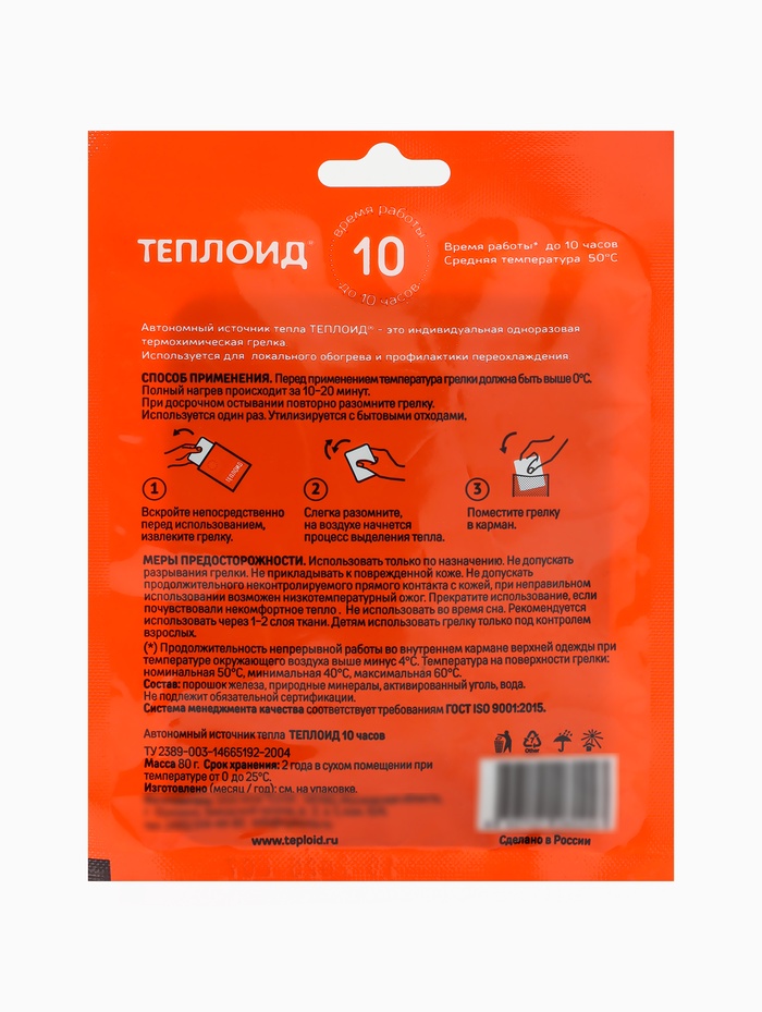Автономный источник тепла "Теплоид" - это одноразовая грелка, которая не нуждается в электричестве или топливе, генерируя тепло автономно. Обычно его размещают во внутренних карманах одежды, в рукавицах, обуви.
