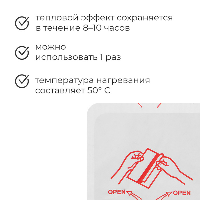 Самонагревающаяся одноразовая грелка для тела и рук поможет не замёрзнуть во время прогулок на улице в зимний период. Благодаря клейкой стороне изделие можно разместить на удобной части одежды. Тепловой эффект сохраняется в течение 8–10 часов.