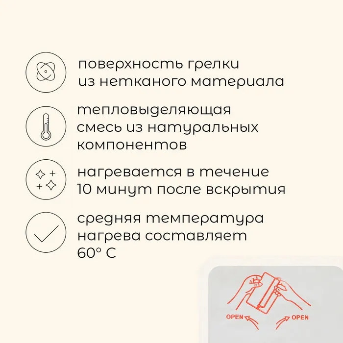 Грелка предназначена для сохранения тепла во время прогулок на открытом воздухе, рыбалки и охоты. Для использования нужно вскрыть упаковку, при воздействии с воздухом грелка начнёт отдавать тепло. Затем её нужно наклеить на одежду.