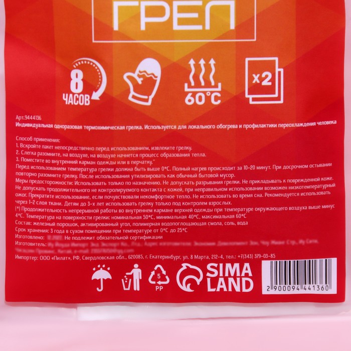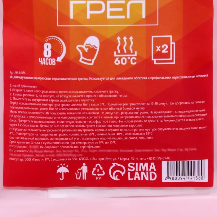 Самое неприятное зимой – это холод. Согреться в мороз вам помогут согревающие пластыри длительного действия. Они изготовлены из безопасных, нетоксичных материалов, которые сохраняют тепло до 8 часов. Пластырь выделяет и равномерно распределяет тепло , тем самым защищает от холода. Самонагревающиеся наклейки начинают действовать сразу же после вскрытия упаковки, за счет экзотермической реакции, которая происходит под воздействием кислорода. Термопластыри защитят вас от холода в любое время года, их удобно брать в походы и на рыбалку. Не содержит токсины.