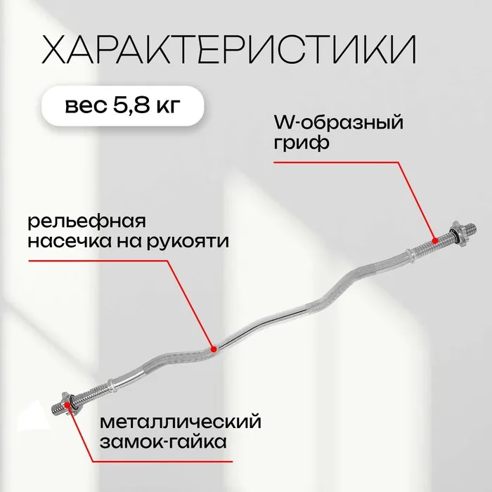 Гриф гнутый Вайдера W-образный с замками ONLYTOP, вес 5.8 кг, 120 см, d=28 мм, до 135 кг — Характеристики