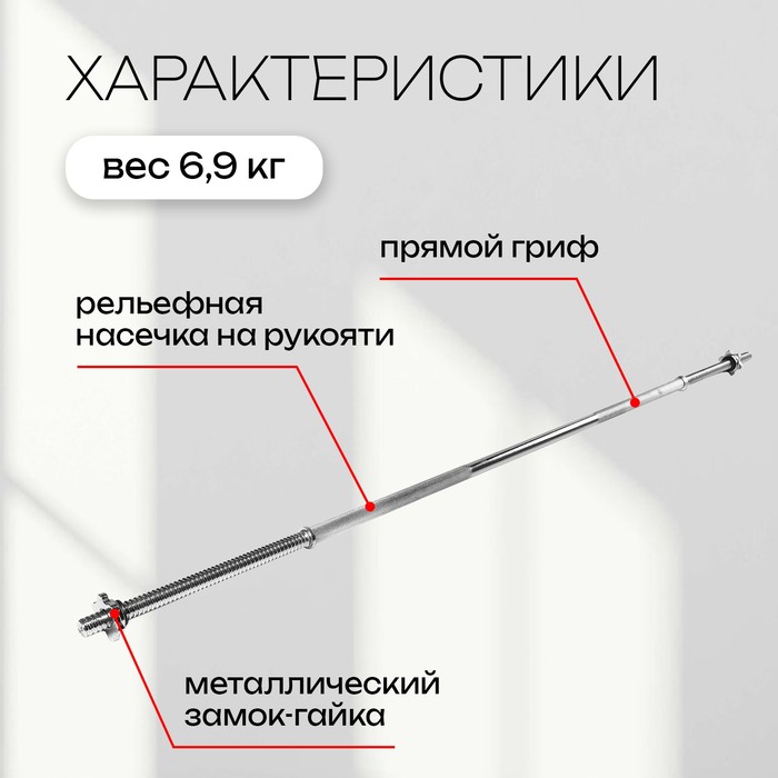 Гриф прямой с замками ONLYTOP, вес 6,9 кг, 180 см, d=20 мм, до 100 кг — Характеристики