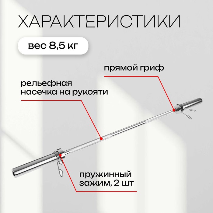 Гриф тренировочный с замками ONLYTOP, вес 8.5 кг, 150 см, d=50 мм, до 135 кг — Характеристики