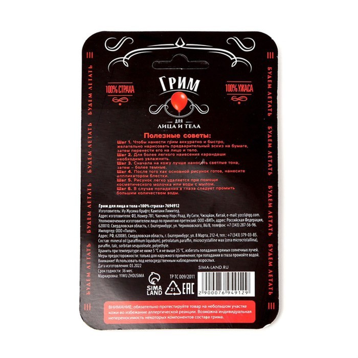 Грим для лица и тела «100% страха» — Характеристики
