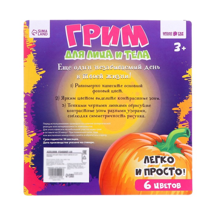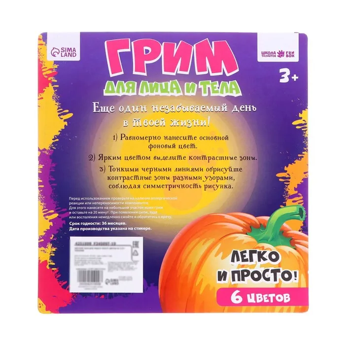 Важно! Перед использованием проверьте наличие аллергической реакции или непереносимости компонентов. Для этого нанесите на небольшой участок кожи аквагрим и оставьте на 20 минут. При появлении сыпи, зуда или воспаления немедленно смойте и обратитесь к врачу.