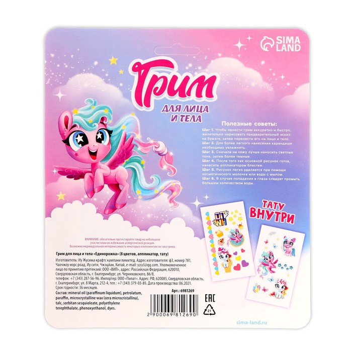 Грим для лица — это декоративная косметика, которая позволит ребёнку мгновенно перевоплотиться в персонажа на свой вкус. А взрослые с его помощью смогут создать неповторимый образ для любого праздничного случая: дня рождения, Хеллоуина, Дня России или тематической вечеринки. В набор входят переводные татуировки для создания уникального и стильного образа. Набор состоит из 8 ярких красок.
