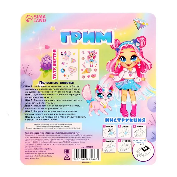 Грим для лица — это декоративная косметика, которая позволит ребёнку мгновенно перевоплотиться в персонажа на свой вкус. А взрослые с его помощью смогут создать неповторимый образ для любого праздничного случая: дня рождения, Хеллоуина, Дня России или тематической вечеринки. В набор входят переводные татуировки для создания уникального и стильного образа. Набор состоит из 8 красок.