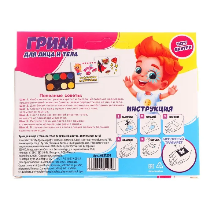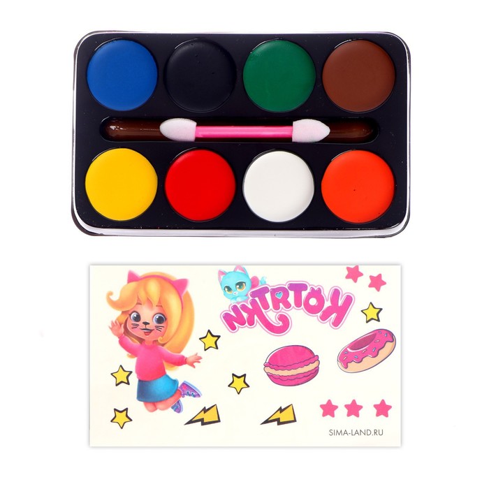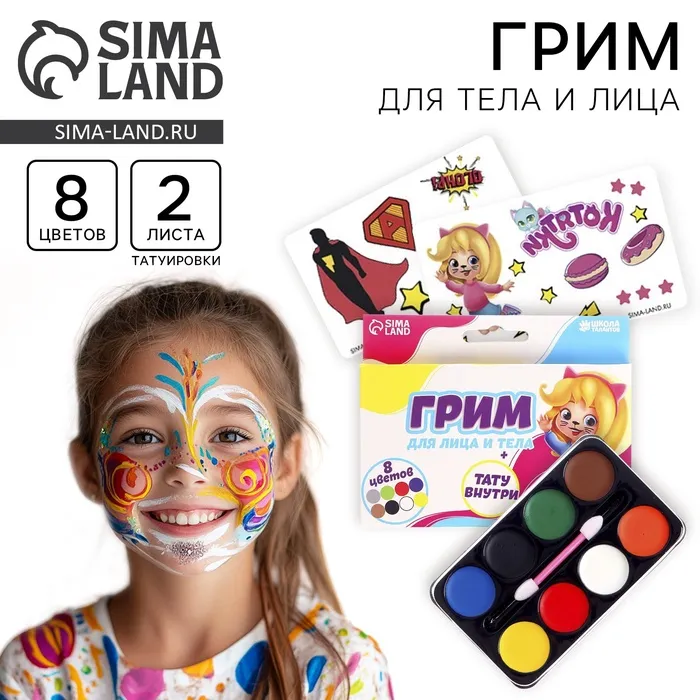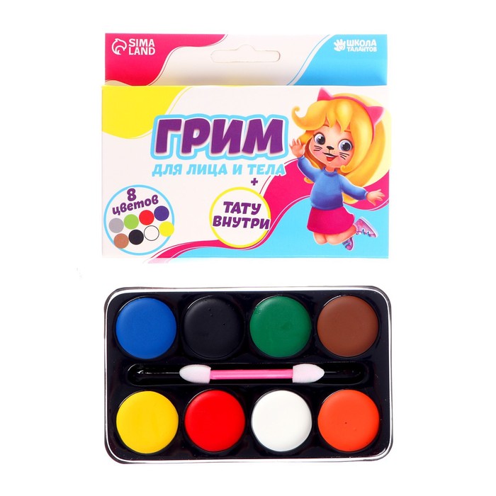 Грим для лица — это декоративная косметика, которая позволит ребёнку мгновенно перевоплотиться в персонажа на свой вкус. А взрослые с его помощью смогут создать неповторимый образ для любого праздничного случая: дня рождения, Хеллоуина, Дня России или тематической вечеринки. В набор входят переводные татуировки для создания уникального и стильного образа. Набор состоит из 8 красок.