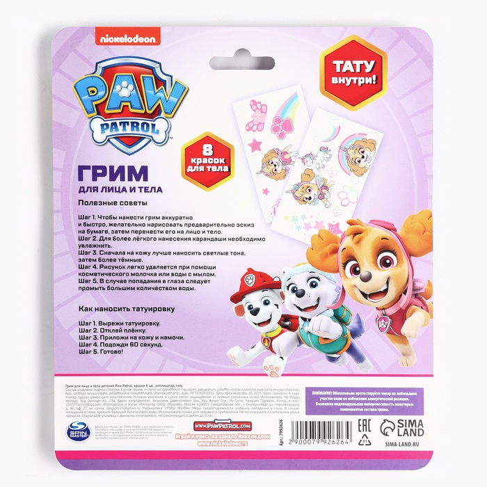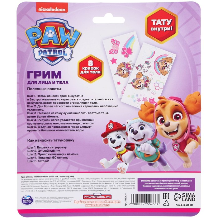 Грим для лица и тела, карандаши 6 цветов, блестки, аппликатор, тату «Скай», Щенячий патруль — Характеристики