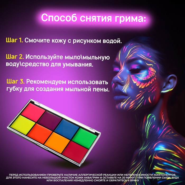Грим для лица и тела, светится от ультрафиолета, 8 цветов — Характеристики