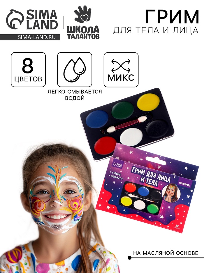 Аквагрим - уникальное средство для творчества на вашем лице и теле. Наш грим обладает яркими цветами, легко наносится и сохраняется на протяжении долгого времени. Аквагрим детский создан с использованием высококачественных ингредиентов, что обеспечивает яркие и насыщенные цвета. Грим для хобби и творчества легок в использование и гарантирует великолепные результаты. Аквагрим для лица абсолютно безопасен для кожи и не вызывает раздражения. Гримм для лица идеально подходит для различных мероприятий, вечеринок, макияжей. Декоративная палетка поможет создавать образы для хэллоуина, с помощью красок можно нарисовать и заменить тени. С помощью аквагрима вы можете воплотить свои самые смелые идеи и создать неповторимый образ на любой праздник, новый год, маскарад, ёлку в школе. Позвольте своей фантазии разгуляться и стать настоящим художником. И, конечно же, аквагрим станет отличным подарком для ребенка, дочке, сыну, внуку, внучке, сестре.