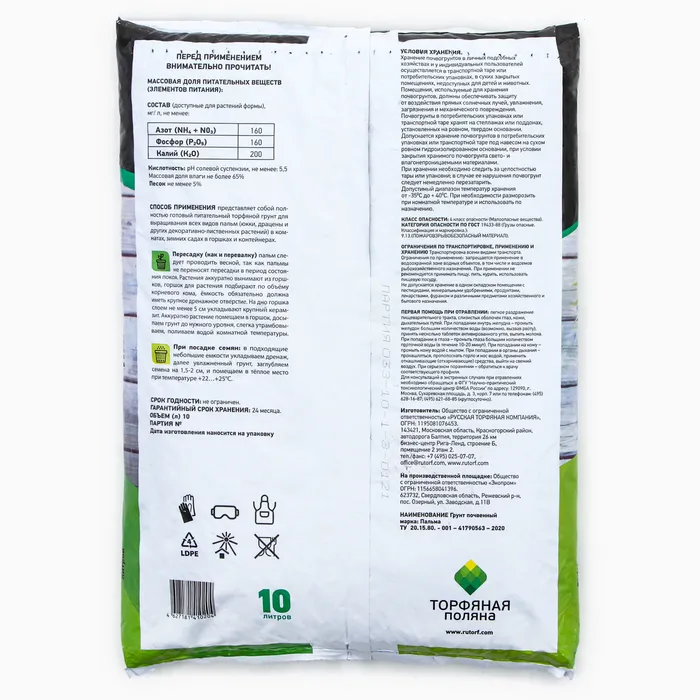 Грунт почвенный Пальма "Торфяная поляна", 10л — Характеристики