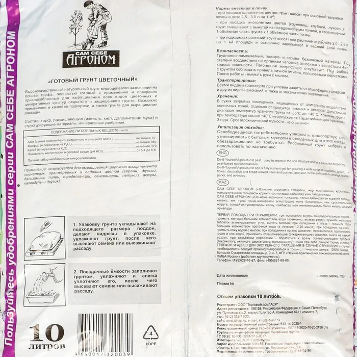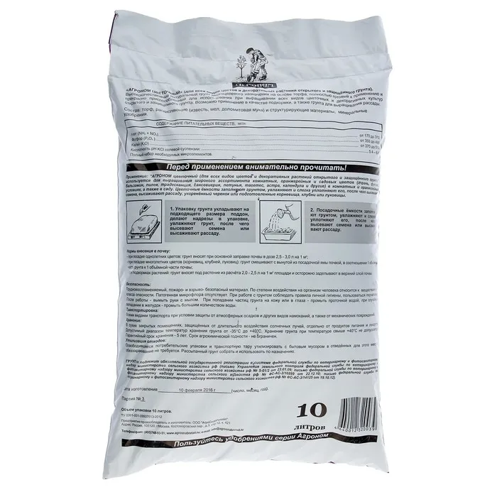 Высококачественный натуральный грунт многоцелевого назначения на основе торфа, полностью готовый к применению и прекрасно приспособленный для использования при выращивании всех видов цветочных и декоративных культур открытого и защищенного грунта. Обеспечивает оптимальные условия для повышения всхожести семян, лучшей приживаемости рассады, улучшения эстетических качеств цветочных и декоративных культур. Возможно применение в качестве подкормки.