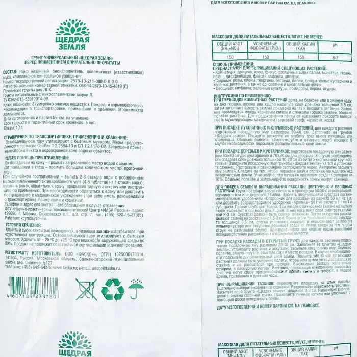 Грунт универсальный Щедрая земля - готовый к применению универсальный питательный грунт с минеральными удобрениями.